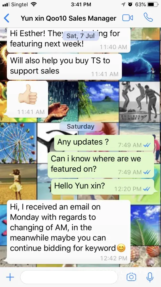My company have been selling on Qoo10 Singapore for more than a year now. Monthly we spending quite a hefty sum just on qspecial and keywords bidding. After becoming an active power seller on Qoo10 we were assigned to Yun Xin (Account manager) since Nov 2017. However no help such as time sales / group buy etc support were render to us. We tried contacting you guys for a change of AM because we just cannot afford to wait 2 weeks - 2 months for a reply from the current AM. In our last WhatsApp conversation with Yun Xin. She refused to assist us on timesale/groupbuy and mentioned that a new AM is being assigned to us. So meanwhile we should just continue with our keywords bidding instead.