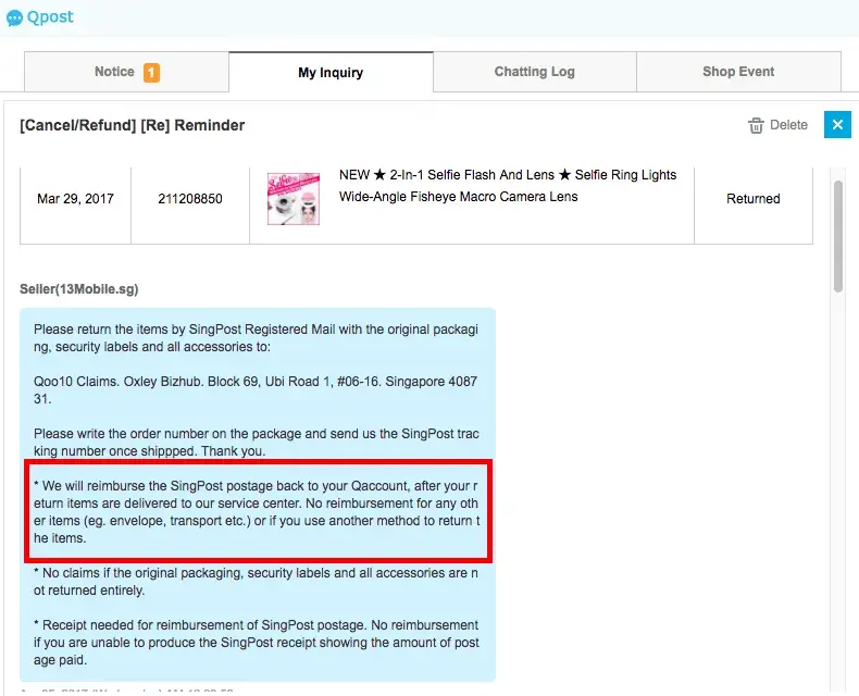 I requested to cancel and exchange one of my orders from 13Mobile.sg when I received a defective product. Somehow, the seller decided to treat it as a simple refund case and did not send me a new product. No matter. But now, they are refusing to refund my postage as they clearly stated they would do. It has been 2 weeks since I returned the parcel and I have still yet to receive any meaningful response from the seller that indicates I will get my refund as promised. I would like my return postage to be refunded.