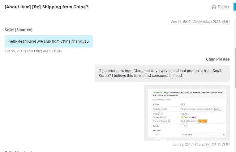 I have placed an order to buy a Micro SD Card, Order number [protected], and it suppose from a South Korea (stated in their advertisement). However, when I checked on the shipping information and I found out it Actually from China. I did questioned the vendor but they just said if I am not happy then can refund. After I received the item and found out the Micro SD card is not functioning, and it just like those Fake product from China and totally not working. I feel being cheated and some need to send it back to the vendor and I borne all the courier cost to Singapore and Back to China but got nothing and just waste Money and time.