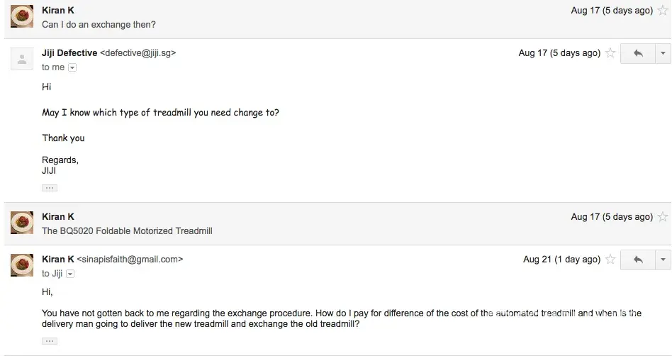 - Extremely slow replies and rude temper. On email, [protected]@[protected]@sg took a week to reply me about the exchange and even then, they replied me one-liners, not explaining at all about the exchange process. When I called the company up, the staff sounded grumpy and displeased and even asked me to email them instead of solving the problem in person (See picture). Delivery company only contacts customers 2 days prior to delivery date, leaving us in the dark about when the delivery would take place. MY FAMILY'S VACATION WAS DISRUPTED BECAUSE OF THIS EVENT. WE WERE GOING TO GO OVERSEAS THIS WEEK BUT COULD NOT DO SO BECAUSE THEY DID NOT CONFIRM WHEN THEY WERE GOING TO DELIVER THE ITEM FOR EXCHANGE.