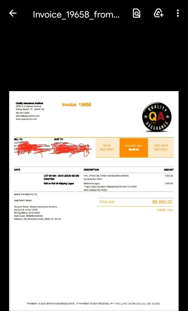 I registered on the portal and monitored offerings to benchmark prices with other auctions and their appears quite reasonable. I soon identified a salvage rebuilt 2014 Toyota Highlander VIN 5TDJKRFH7ES012294 for which I placed a bid of $18, 764.00 which was later approved as a winning bid. I was contacted few days later by email and phone that I should make payment to enable them secure the car. I was contacted severally by phone via +[protected], +[protected] and +[protected] and e-mails via support@qaauctions.com, karen@qaauctions.com, arthur@qaauctions.com and alex@qaauctions.com.