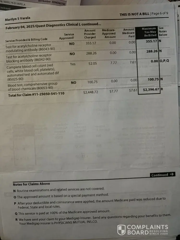 I tried to get the coding corrected on my bill so Medicare can cover it. Noone at quest can or will help. It’s my problem? It is, people are not aware of pricing for lab work. “Routine†blood work for Myasthenia Gravis costs: $2396.67. To stop collections while I try to get it fixed I want to pay on this bill I was told that won’t stop collections