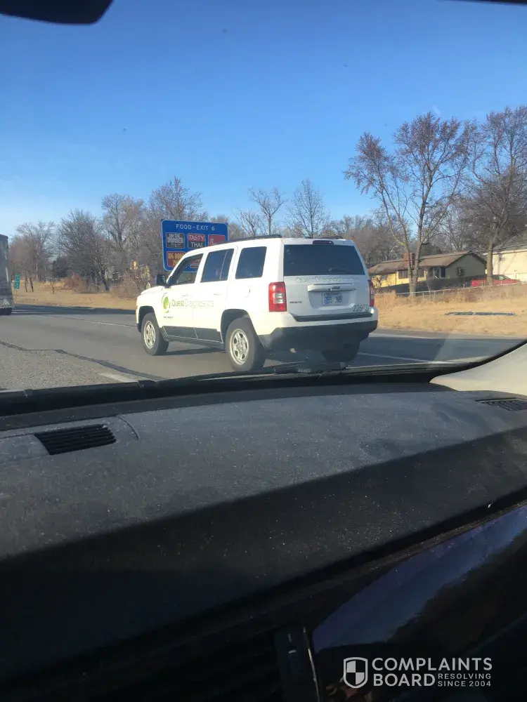On July 10th, 2017 around 6:30 pm the driver of a Quest Diagnostics vehicle #30698, failed to make a complete stop at the intersection of Anza Ave. & Banning St. in Lehigh Acres, FL. At this intersection there is a stop sign on Anza Ave. going South and North, which would give vehicles traveling on Banning St. the right of way. As I was traveling on Banning St., not even 20 feet from making a left hand turn onto Anza Ave., the driver failed to make a stop and I had to slam on my brakes, thankfully no one was injured and no accident occurred. The driver was to occupied on his cell phone that he did not make a stop.