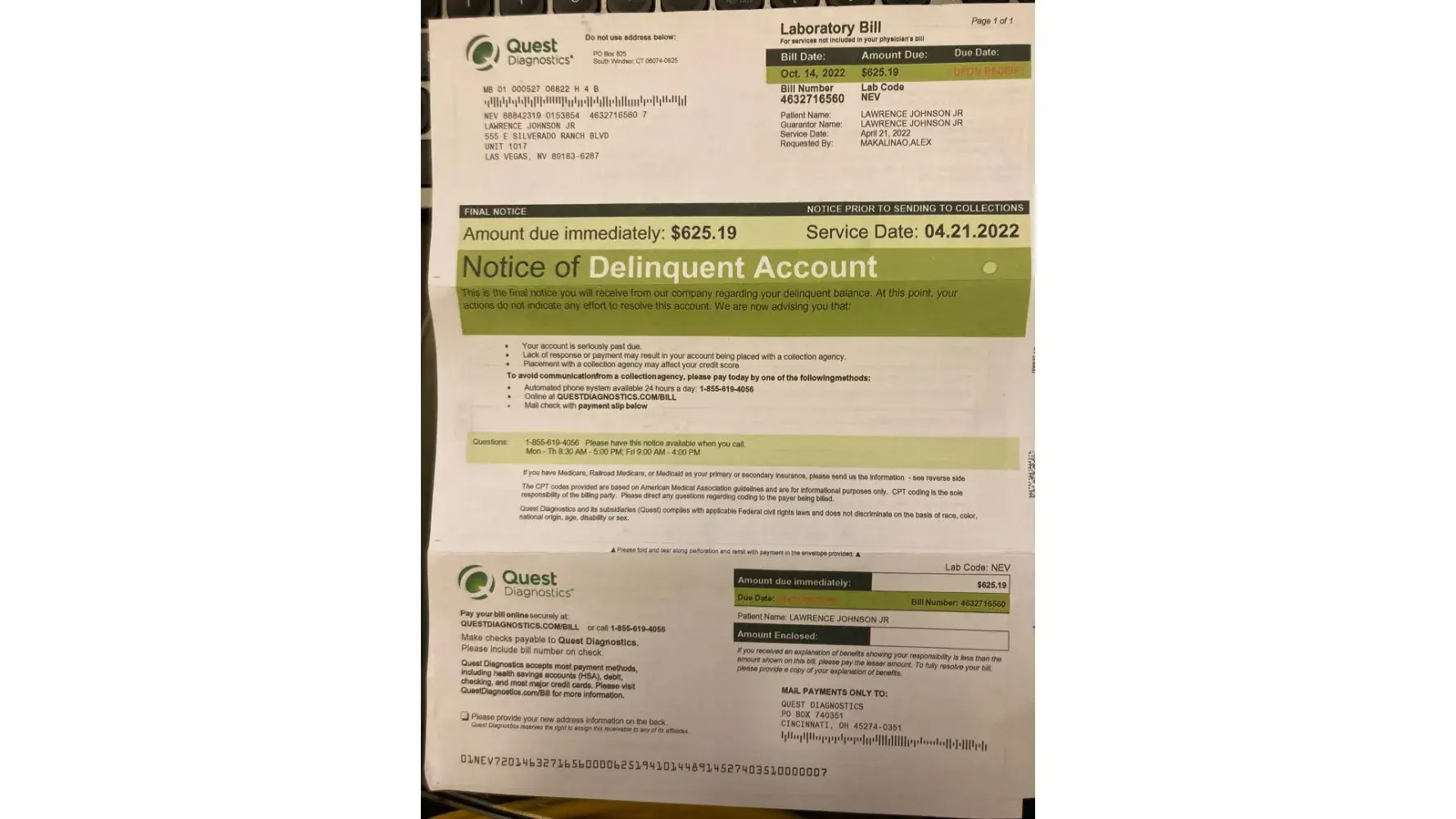 This happened not one time but couple time to our family. We always keep our credit clean and pay our bills on time. Never get late bill. We not going to use quest diagnostics anymore.