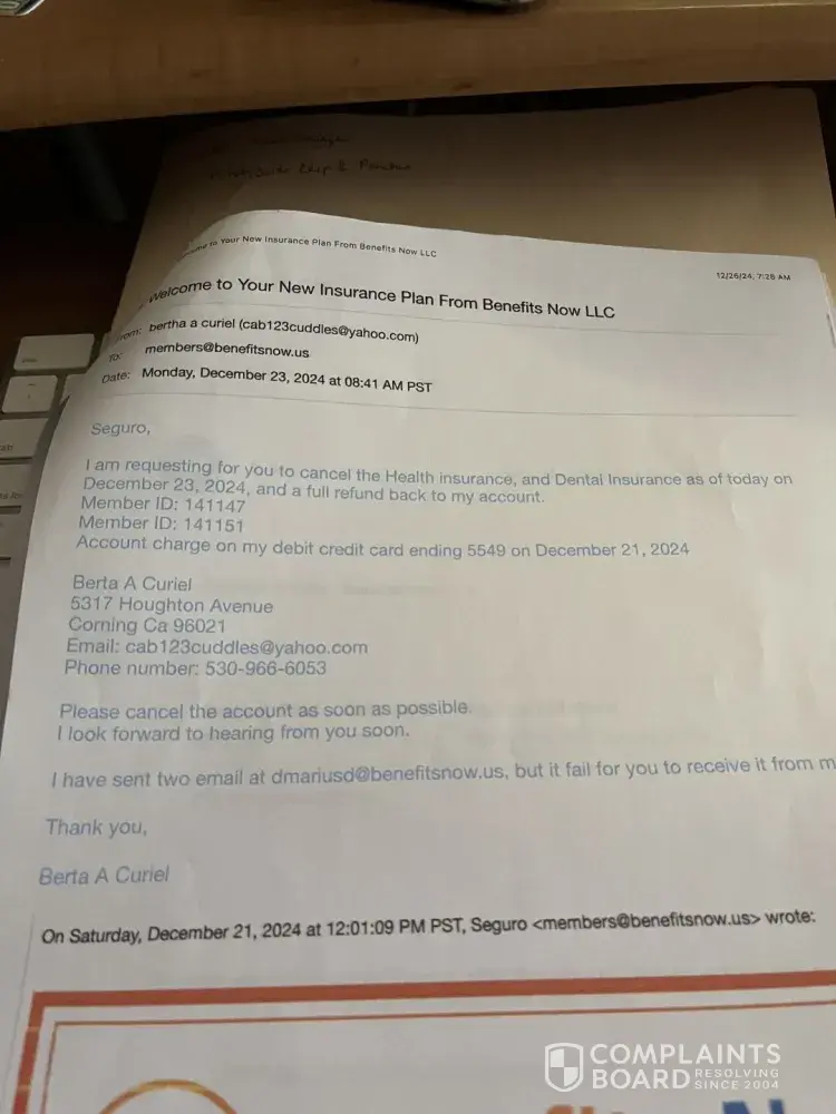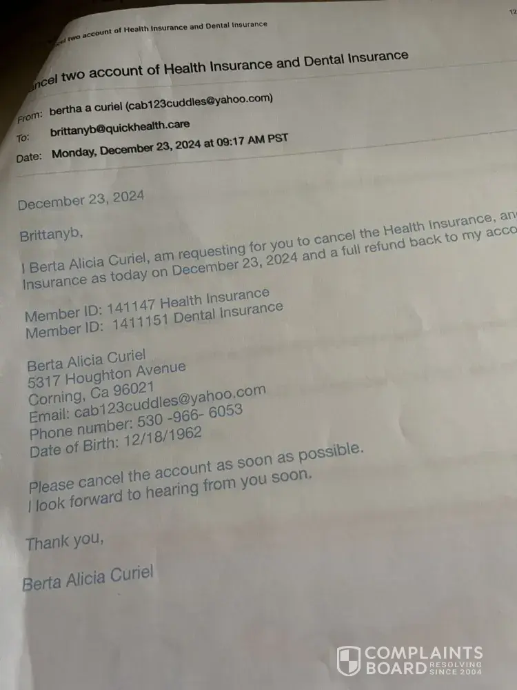 On December 12/2124-12/23/24 I had contacted through email through [protected]@quickhealthcare.com, and Seguro [protected]@benefitnow.us, and asked a representative agency to please cancel the two accounts of health insurance, and a refund for $273.74 back to my bank account of Tri Counties Bank. I had given them all the information to closed the account as soon as possible, and a refund as soon as possible as of December 23, 2024. The company never responded back to me about that the account has been closed and to let me know they have refunded me that amount on my account at Tri Counties Bank.