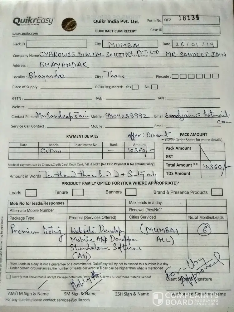 Sandeep Jain Its a fraud company. Do not get trapped by their marketing tactics. Our company, Cybrowse Digital Solutions Pvt. Ltd, had registered for Quikr Easy Business Services on 21.02.2019. Under this service contract, Quikr was supposed to share genuine business leads to Cybrowse Digital Solutions Pvt. Ltd. The pack order ID for this contract is - SVC388934COM336576HYD00103SFT