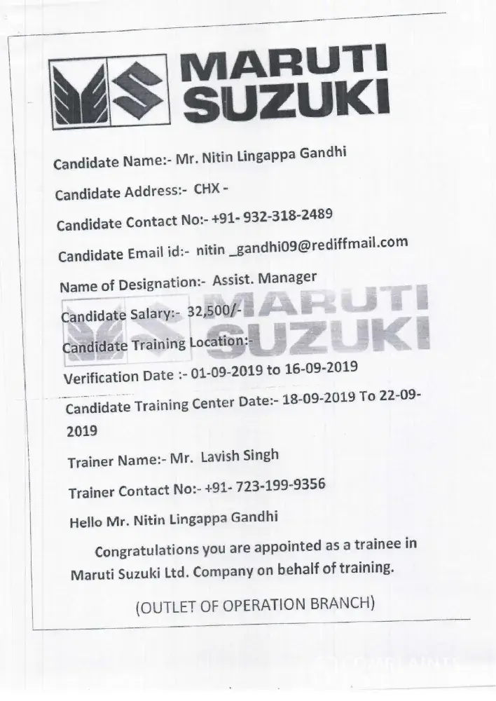 ANJU MADAM MO.7052664039. I have call him he said sent doc. so i send it. After that she told me you want to pay Rs.1600 reg.fee refundable. She send me SMS with bank details as under. I pay Rs.500 to that account. After that she demand Rs.7000/- for doc.verification & computer etc.. I have not paid that amount and request to refund fee. After that he send me appointment letter & Employee code. and demanding Rs.7000/-. I send mail to samsung co. he reply this is fake. So i send mail for refund my fee not reply.