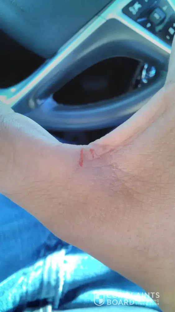 I visited your location in Georgia off hwy 124 and Ronald Reagan. I parked at the air pump and grabbed the hose and felt a very sharp pain in between my thumb and index finger felt like my my hand was stuck or bit by a huge wasp or big spider ( been stung and bit) but a little more sharp I automatically looked to see if it were a bug but there were small needle-like wires sticking out from the hose where I believe there used to be rubber. My hand started to bleed I know first aid so I controlled the bleeding and went inside to wash my hands and fixed a fountain drink and I let the cashier know about the wires and advised to post something so nobody else would get hurt. I attached pic the day after.