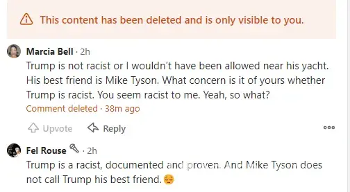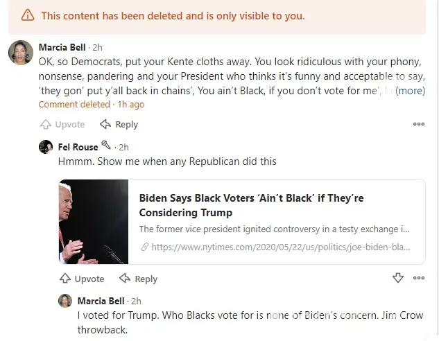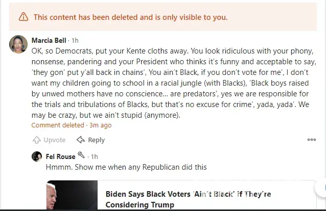 Other times, I have been deleted for using the exact same words, names, demeanor (all planned) as the leftist person I am responding to. I turn them in and they don't get deleted, but I do.
