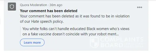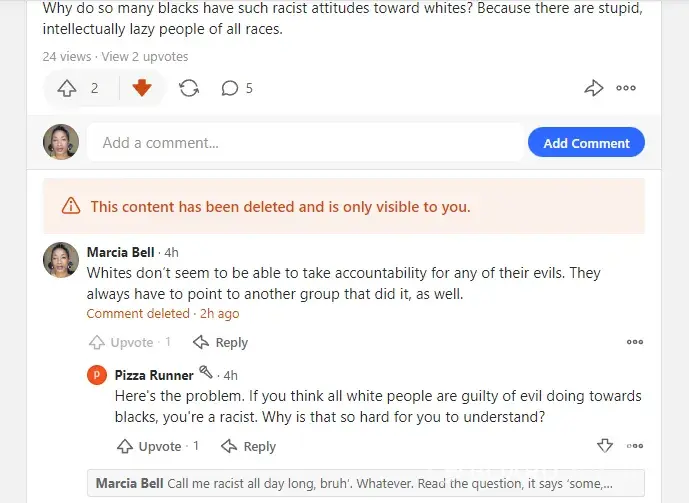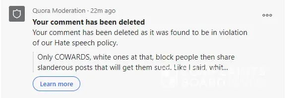 For months, Quora has targeted my posts and, possibly, one of it's own employees stalked and slandered me with no repercussions whatsoever. Everyday, I received notices from Quora that my comment or posting had been removed due to 'community standard violations'. Quora accused me of using 'hate speech', which was a mockery of the real injustices minorities had to endure in the US for decades to centuries with no ability to speak.