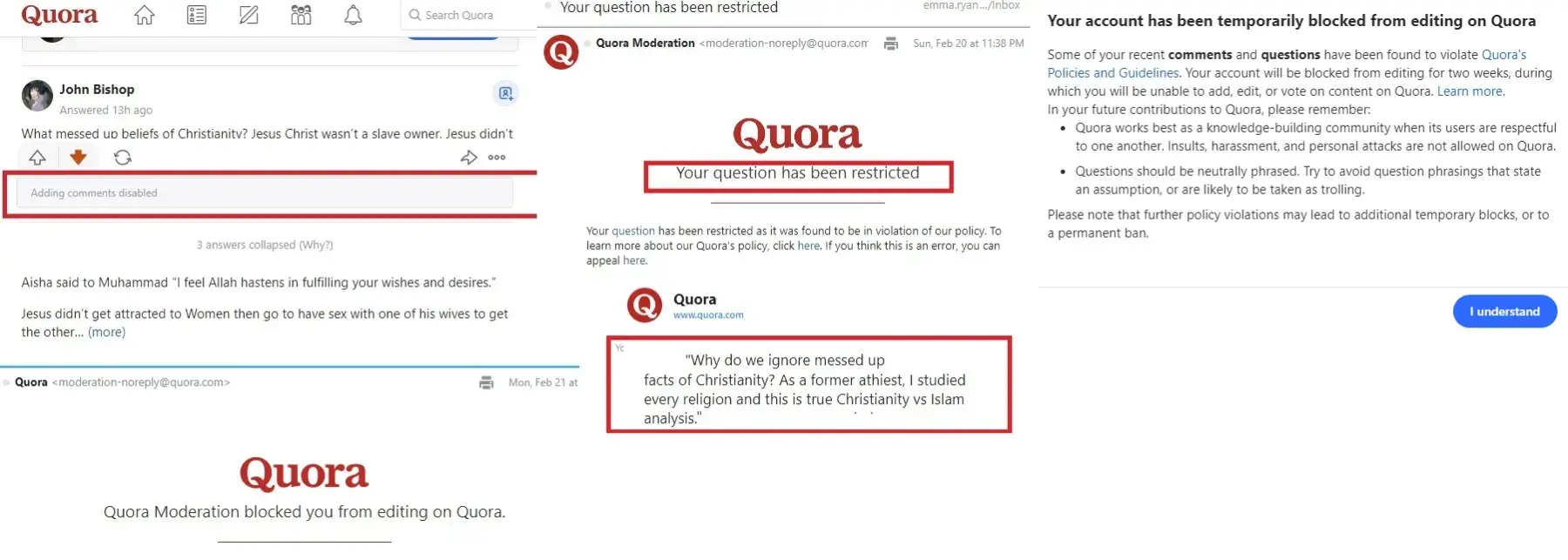 Its been 5 years that I have been noticing how flexible Quora policies are in promoting hatred and abuse against Islam. Anyone can pop up with false acquisitions against Prophets of Islam specially Muhammad Peace Be Upon Him, people can literally twist sentences from Quran into their own twisted version and keep comparing Islam with religions where god breeds with his own created children or cow's urine is compulsory if animals created you. Dare you return the favor and discuss the abnormalities of Christianity or Judaism or Hindu, you will be banned, deleted and not allowed to even write! Even if you belong to a different faith and do not believe any humans should be killed based on their skin color, ethnicity or religion then try discussing positive things about Islam and you will see how you will be attacked by the paid retired psychos of Quora. Within seconds your account will be blocked and your comments will be deleted while hate speech against Islam is all over Quora and never deleted despite reporting it is unnecessary attack on Muslims who are the new blacks and want to live in peace. In the past, they claimed no discrimination against Muslims yet you can literally search any hate towards Muhammad or Islam and you will find Millions of articles upvoted by Quora but not a single one against any other religion.