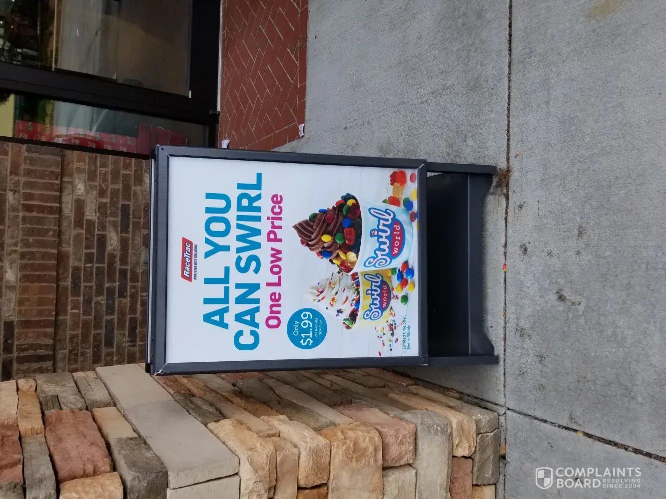We stopped by Racetrac at east west connector Smyrna to get a frozen ice cream advertised for 1.99 any size my son got the big cup . AT the cashier he told us 4.02 explain to him it's 1.99 in the advertisement board . Then he said that's for a small cup.