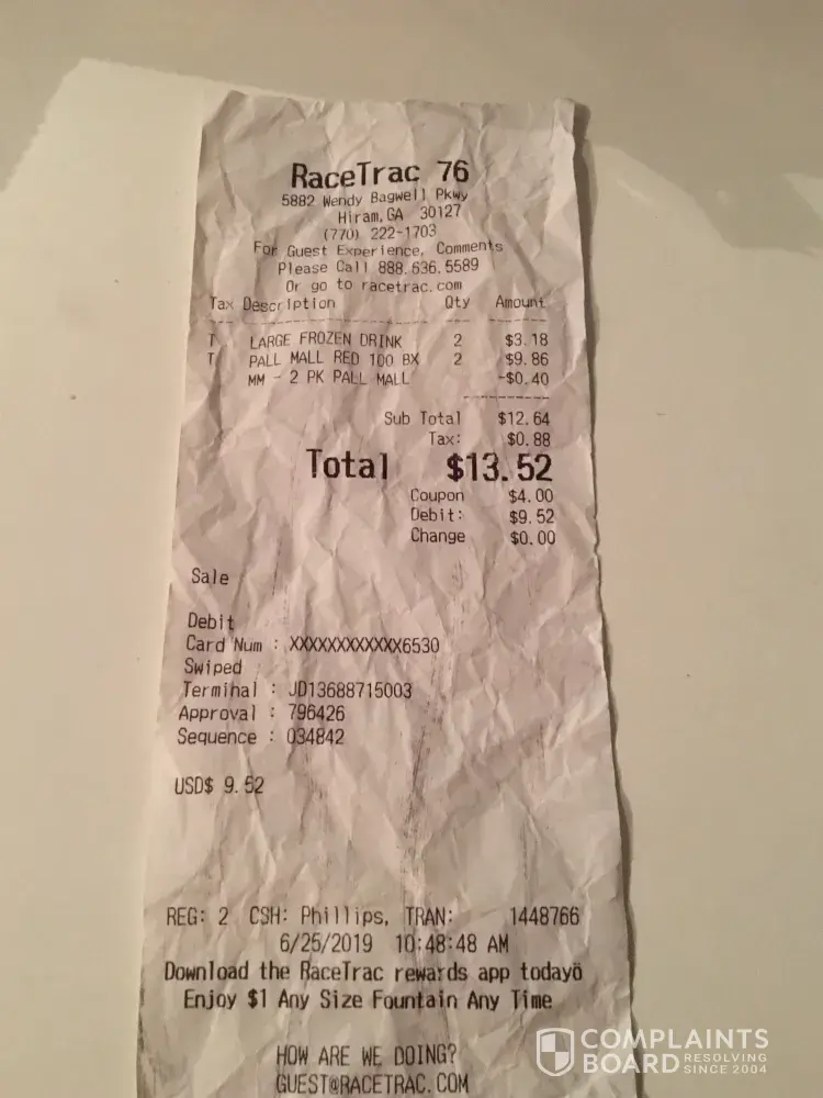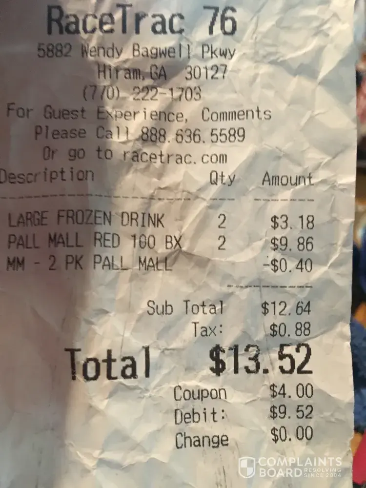 Today I went in the RaceTrac on 5882 Wendy Bagwell Pkwy in Hiram, Ga 30141 at 10:48:48 am on Register #2 with Phillip as cashier. Transaction #1448766- I bought 2 Large Frozen Cokes and 2 packs of Pall Mall Red 100 Bx and I had a coupon for $4.00 off 2 packs. Well I used my debit card and was looking at my receipt and he only took off $0.40 off the cigarettes. This is the second time this has happened at this store. I'm very upset AGAIN for this to happen. Don't know what they are using coupons for themselves or what but I think this should be taking care of. It's the same as if he stole from me.