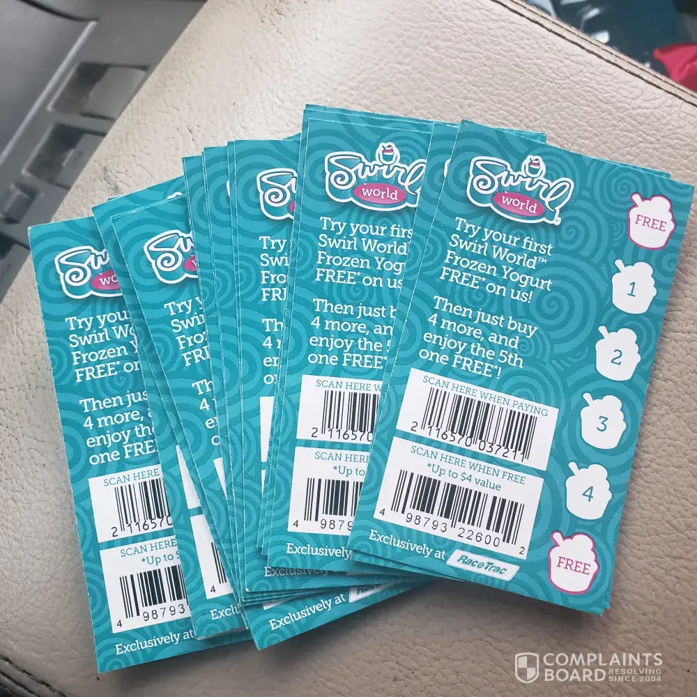 I bought a racetrac cup that was completely factory sealed and it had swirl world coupons and free refill coupons the coupons do not have an expiration date on them I tried to use the swirl world coupons at the only racetrac with a swirl world in my area and the manager was a little rude and told me I couldn't use the coupons but couldn't give me an...