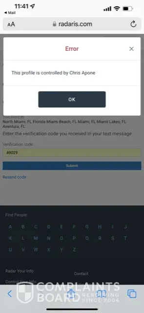Radaris will not remove my online profile. I have sent them multiple emails and they keep sending me a link that requires a code be sent to your phone. they tell me to login to my account which is terrible that you have to create an account. Then i provide my cellphone number and they text a code. The code does not work and keeps giving me an error. Please see attachment below. This is my profile. I need them to remove my profile asap. I have tried multiple times.