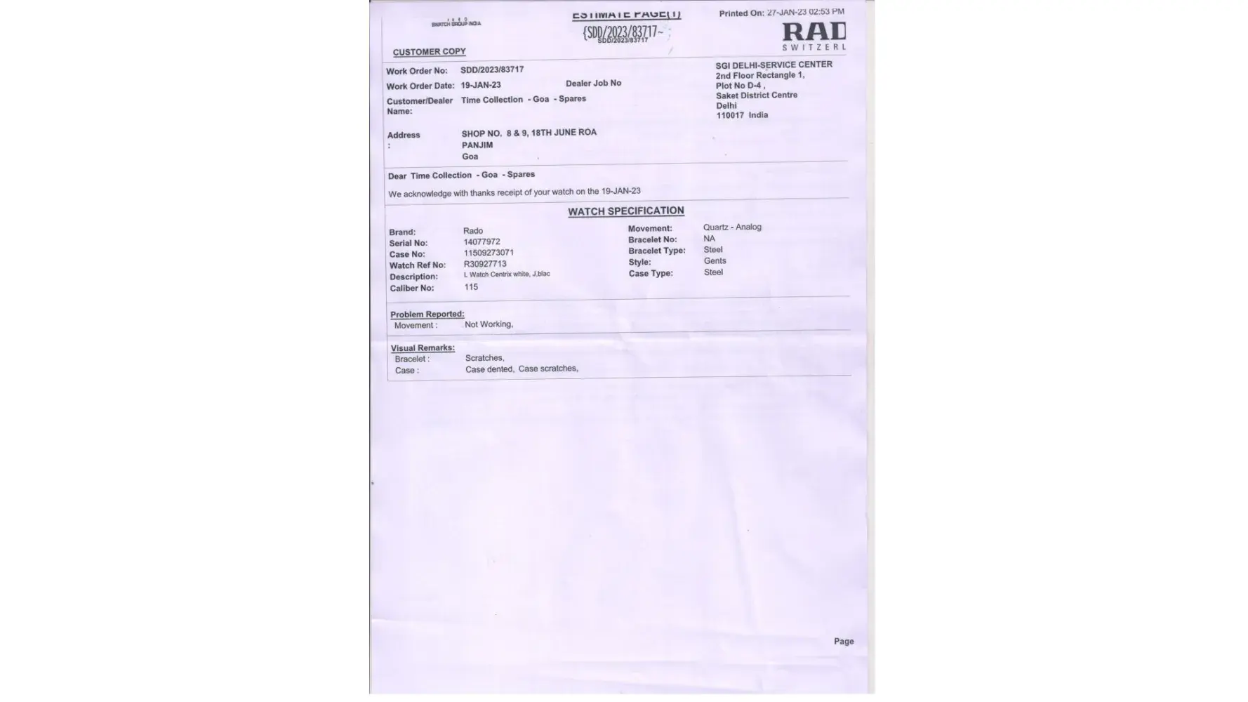 I wish to bring to your attention that the cost of this watch is more than AED 4, 000 bearing a prestigious tag like Rado should fade away so quickly. Is this the quality & service we are expecting from reputed brands? This ultimately leads to the conclusion that the watch is not in its original form and we the customers are being fooled. Should we be charged such an exuberant amount for no fault of ours?