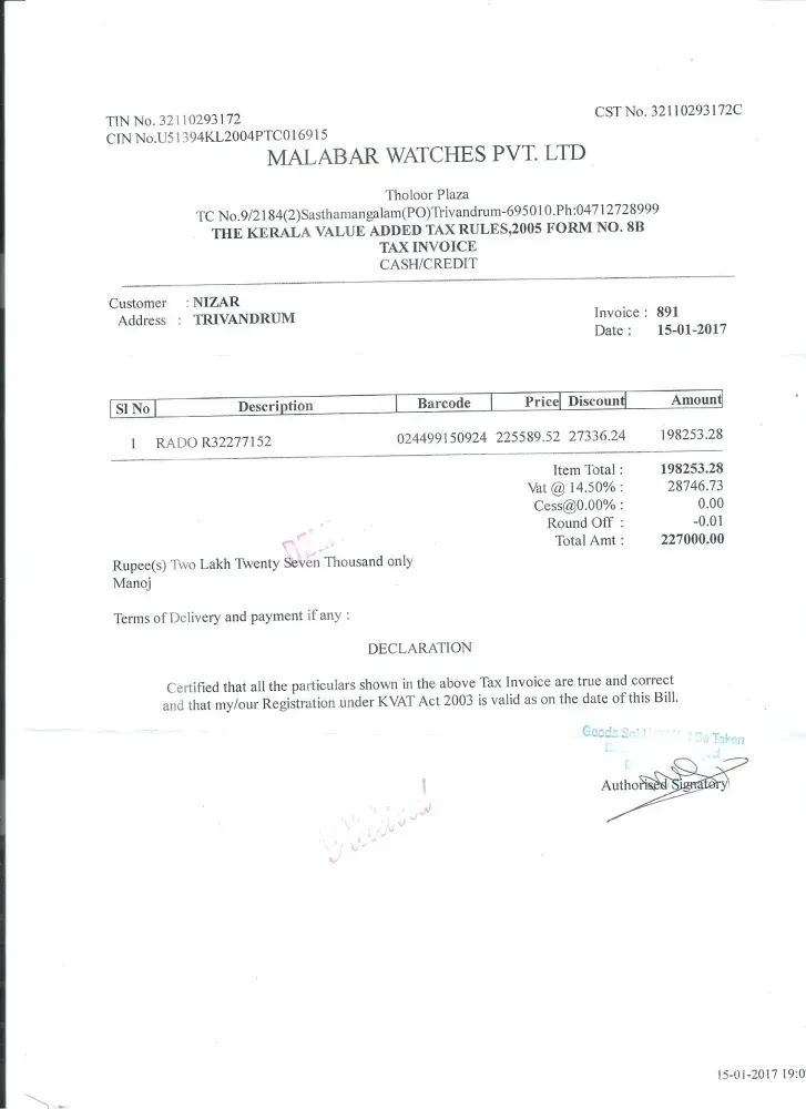 I purchased a Hyperchrome Rado watch from your retailer MALABAR WATCHES PVT.LTD, Sasthamangalam, Trivandrum, Kerala, India.