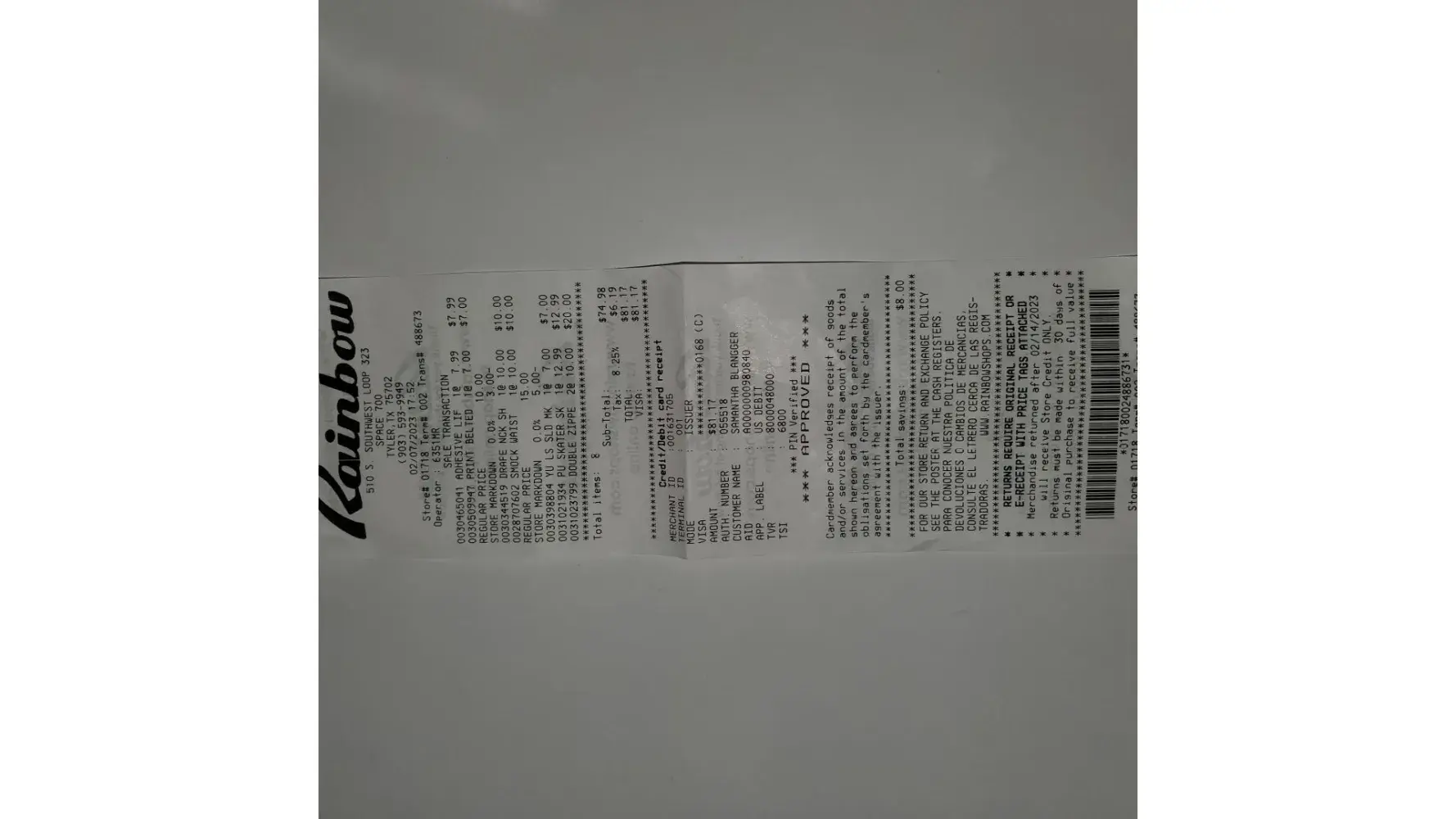I ORDER ONLINE AT LAEST 3 TIMES A MONTH... THEY SEND IT WITH A RECEIPT... IM ABLE TO RETURN THE CLOTHES TO A STORE IF THEY DONT FIT,,, AND ITS NEVER A PROBLEM WITH THE RETURNS... ALSO,,, MY ORDER WAS TAMPERED WITH AND SOMEONE STOLE SOME ITEMS AND THEY REFUNDED ME FOR THOSE ITEMS... I LIKE RAINBOW CAUSE THEY HAVE CUTE CLOTHES AT A CHEAP PRICE,,, SHIPPING DOESN'T TAKE LONG... AND THEY'RE VERY HELPFUL WHEN PROBLEMS HAPPEN