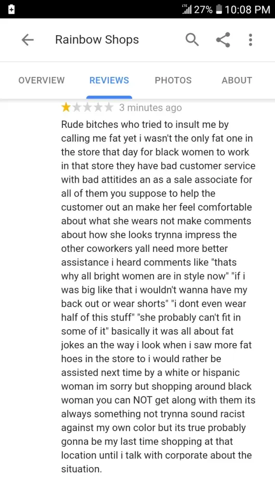 Today at 6:09pm I was in rainbow where I was threatened and disrespect by the employee bc they did not like that I was returning something they called me every name in the book when I asked who to call the lady just pointed to a paper not saying nothing about her employee not once did they ask her to chill or watch how u talk to the customers my 5 year old child was there whern she walked up to me with a pole in her hand (hanging clothes pole) and threatened me and walk to me calling out my name saying how she'll hit me and put me out the store again no one said anything to her and the whole time my child was watching this I called the number talked to someone I asked for her name and the manager wouldn't answer me at all I called the cops and waited for them when they got there 2 talked to me and I said I wanted to make a report they waited till the 3rd officer came up from talking to them and said that I wasn't allowed in the store and I needed to leave did I understand that I said so u worried about that and not that I called and want to make a report because she threatened me in front of my 5 year old still no one care that I stood there in tears as my child had to watch I woman use a weapon and threatened me and the cops said well it's a store she was hanging up clothes no she was not I said so no one cares that I was mistreated and threatened ated in front of my child bc they said it didn't happen this is how stuff and people get hurt cops not caring is wrong employees threatened me calling me b words and mid treating me is wrong and to say there's nothing I can do about is even more wrong this woman walked up to me in front of my child and she had to watch her call me out my name disrespect me and threatenen me with the hanging pole