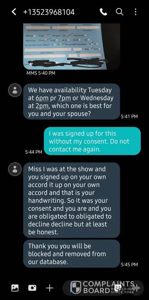 I was contacted the other day by a rainbow representative trying to schedule me for a free in home demonstration. It turns out my abusive mother that I'm no contact with signed me up for it. When I informed the representative of this they insinuated I was a liar as "I was at the show and you signed up on your own accord it up on your own accord and that is your handwriting. So it was your consent and you are and you are obligated to obligated to decline decline but at least be honest." (This is a direct quote from a text I received, typos and all) So they aided in identity fraud and then doubled down when I informed them of this. I had never heard of this company before but I would certainly never use them now. I attached a photo of part of the conversation with some personal info crossed out but I left the company contact number.