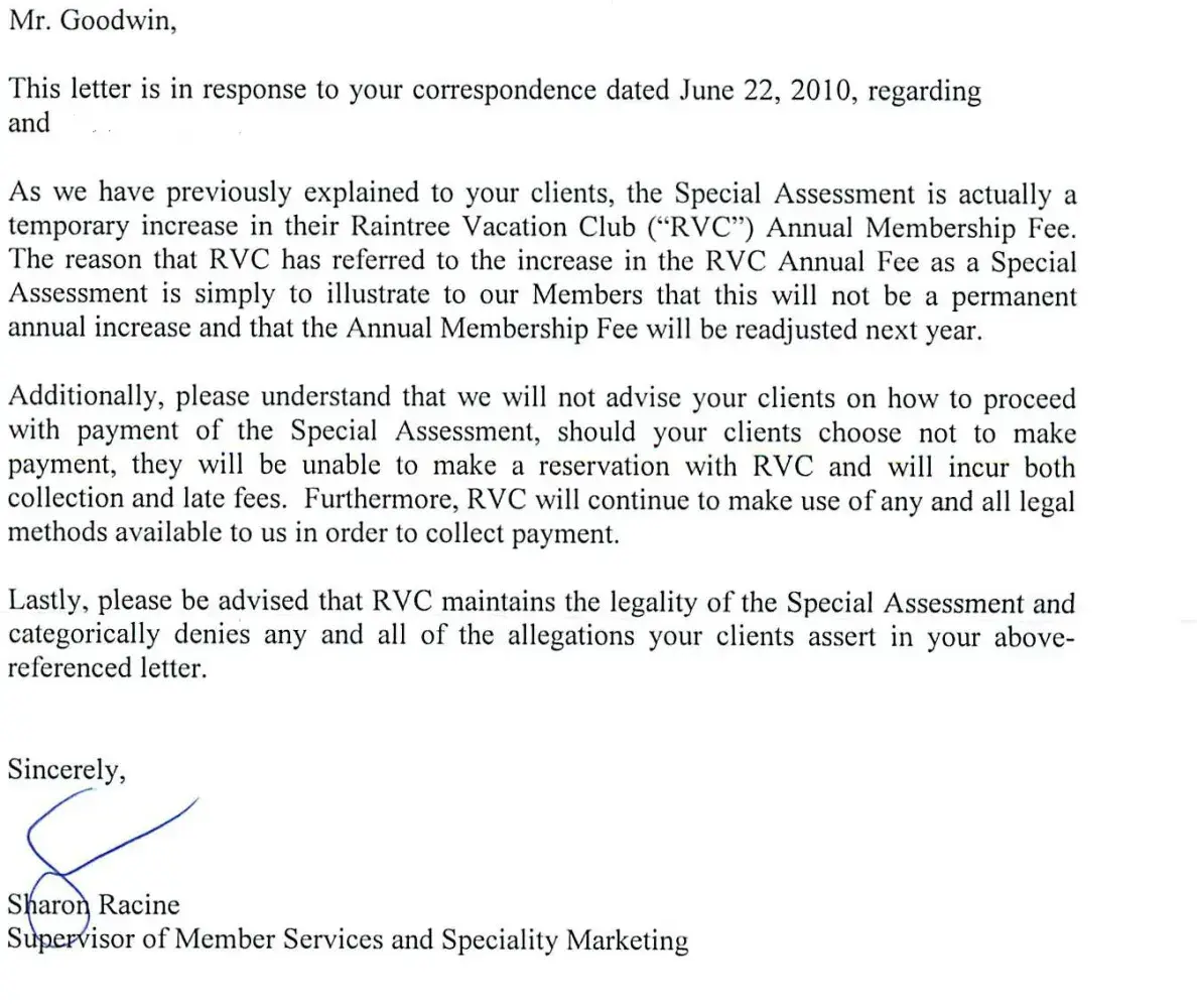 You are hereby notified that our clients have not authorized Raintree’s “Special Authorization Fee.” You are also hereby notified that you are to immediately cease and desist all attempts to collect such a fee. To cease and desist you must stop all attempts at collecting such a fee and maintain our clients’ good standing because aside from this disagreement, our clients enjoy their relationship with your organization and they look forward to fulfilling all their legal obligations owed under the controlling contracts.