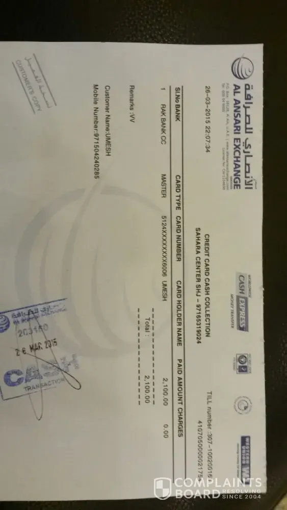 My name is Umesh Gharat from India, Mumbai. I was the RAK bank credit card ( [protected] )user in Dubai, i lost my job due to recession and back to india in march 2011, without paying credit card outstanding due to some financial issue. After 2 years i received Email from Mr.Faisal Iqbal, RAK BANK Collection & Recovery - PB Credit, for credit card payment. I propose him for minimum full & final settlement amount and he agreed for that. Later on i paid 4, 200 dhs within 2 installment and then asking for NOC / settlement latter but Mr. Iqbal did not replied me. I tried several time by writing email to him but still no update on this matter. Lets have look on all that email and payment detail which i have done from RAK bank ATM machine at Dubai & Sudi arab.
