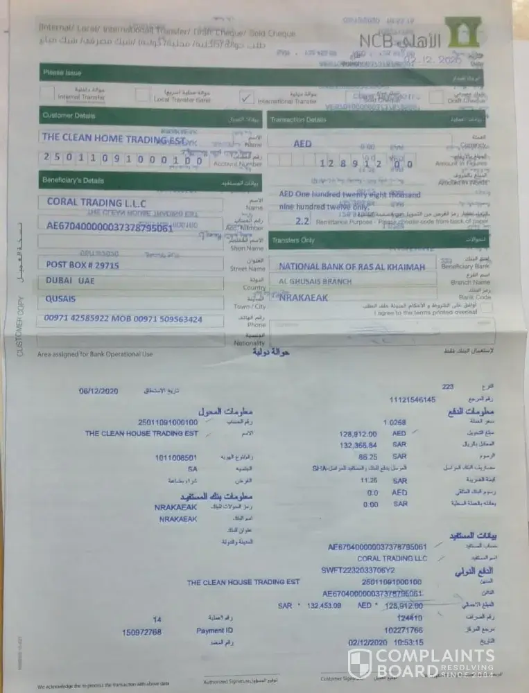 We, The Clean Home Trading Est., maintaining account with National Commercial Bank, Saudi Arabia remitted AED 128912.00 to M/s Coral Trading LLC maintaining account number AE670400000037378795061 in Dubai, the value date of the credit is 06.12.2020. The beneficiary has informed us that they have not received the remittance till now. We have also sent the swift copy of the remittance to the beneficiary which has been forwarded to your bank. The Swift reference number is [protected]. But your bank has informed the beneficiary that the amount has not been received without properly scrutinizing the swift record. We request you to look into the complaint and resolve the issue immediately by crediting the amount in the beneficiary's account.