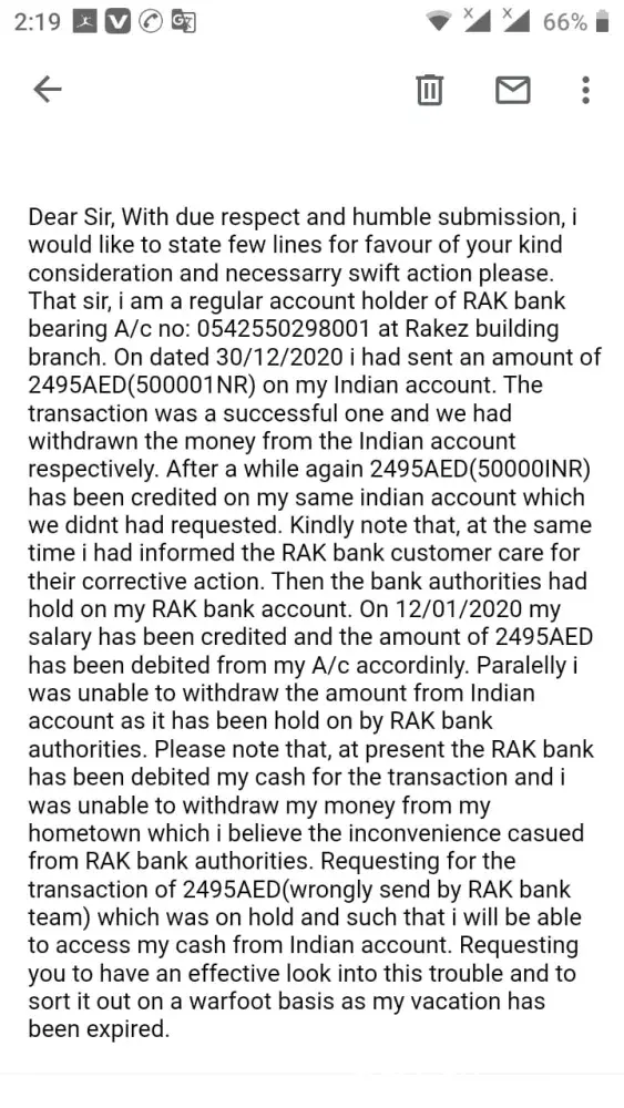 The customer care told me to go to the RAK Bank, which I visited and explained the situation with all the necessary documents. At the bank they assured me that this will be resolved and waive off the outstandings.