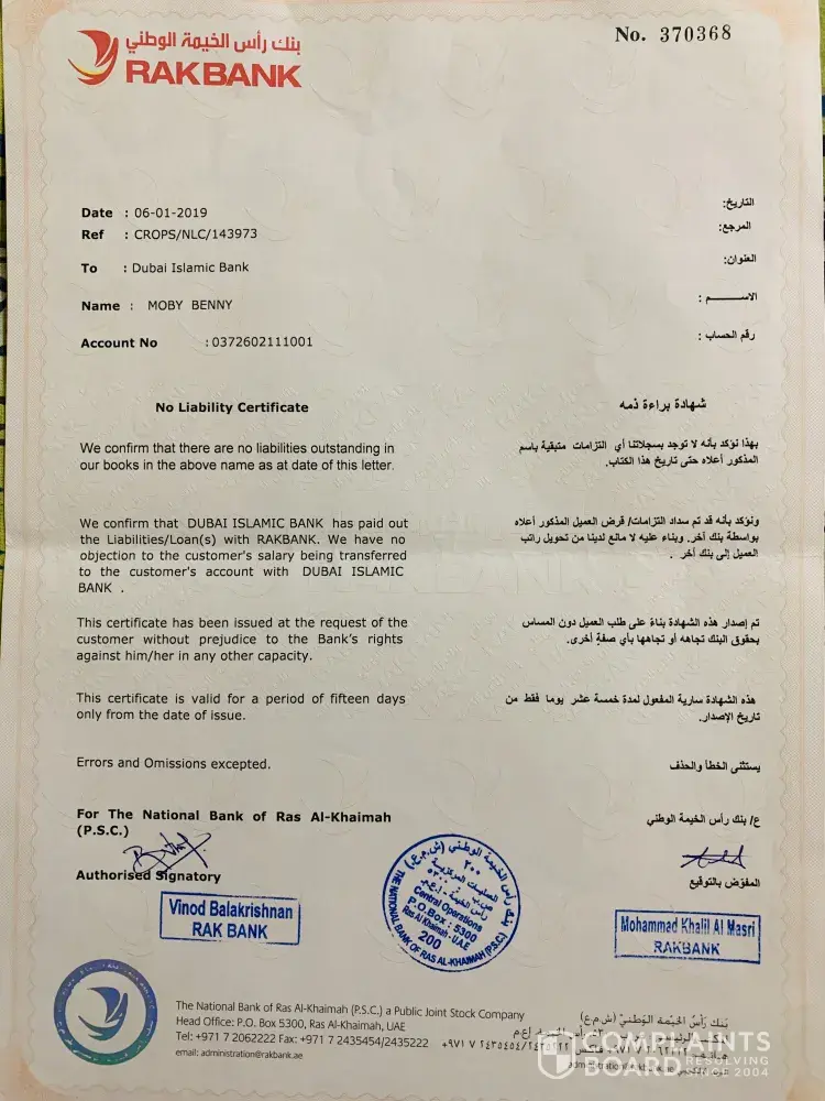 Please note the attached non liability letter from RAK bank, for your reference, But RAK is stupidly holding my excess amount after issued a non liability. Which is the amount of 2757.07 dirhams. So what you people mean by a non liability letter, and what kind of rights you have to hold my money in your bank.
