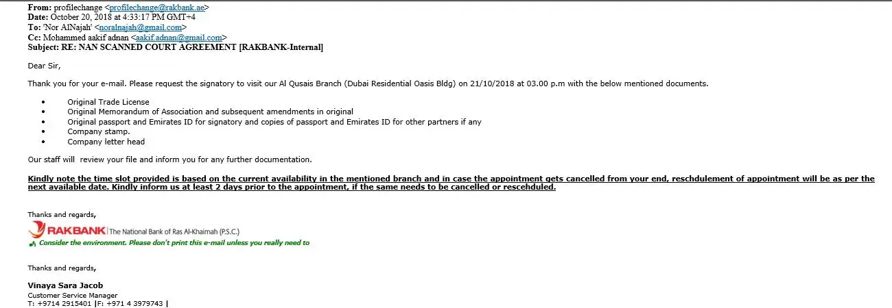 He also asked me to sent an email to his Manager [protected]@rakbank.ae but to my surprise he also not responded even after sending reminder emails