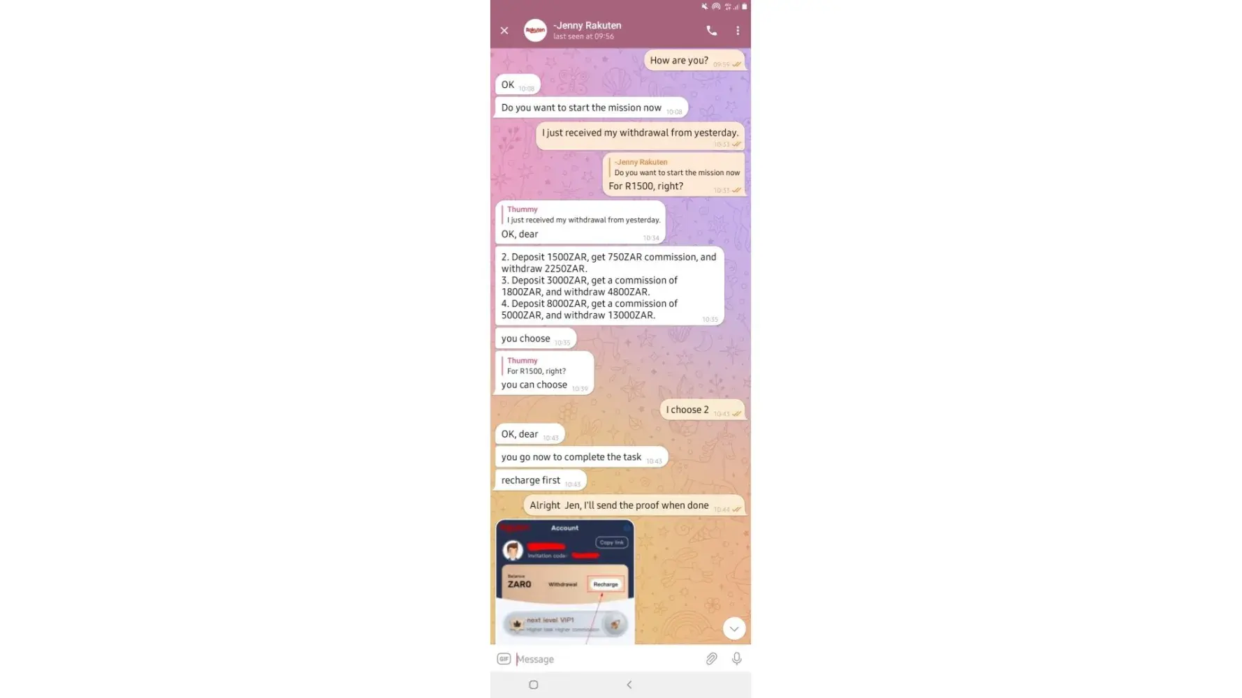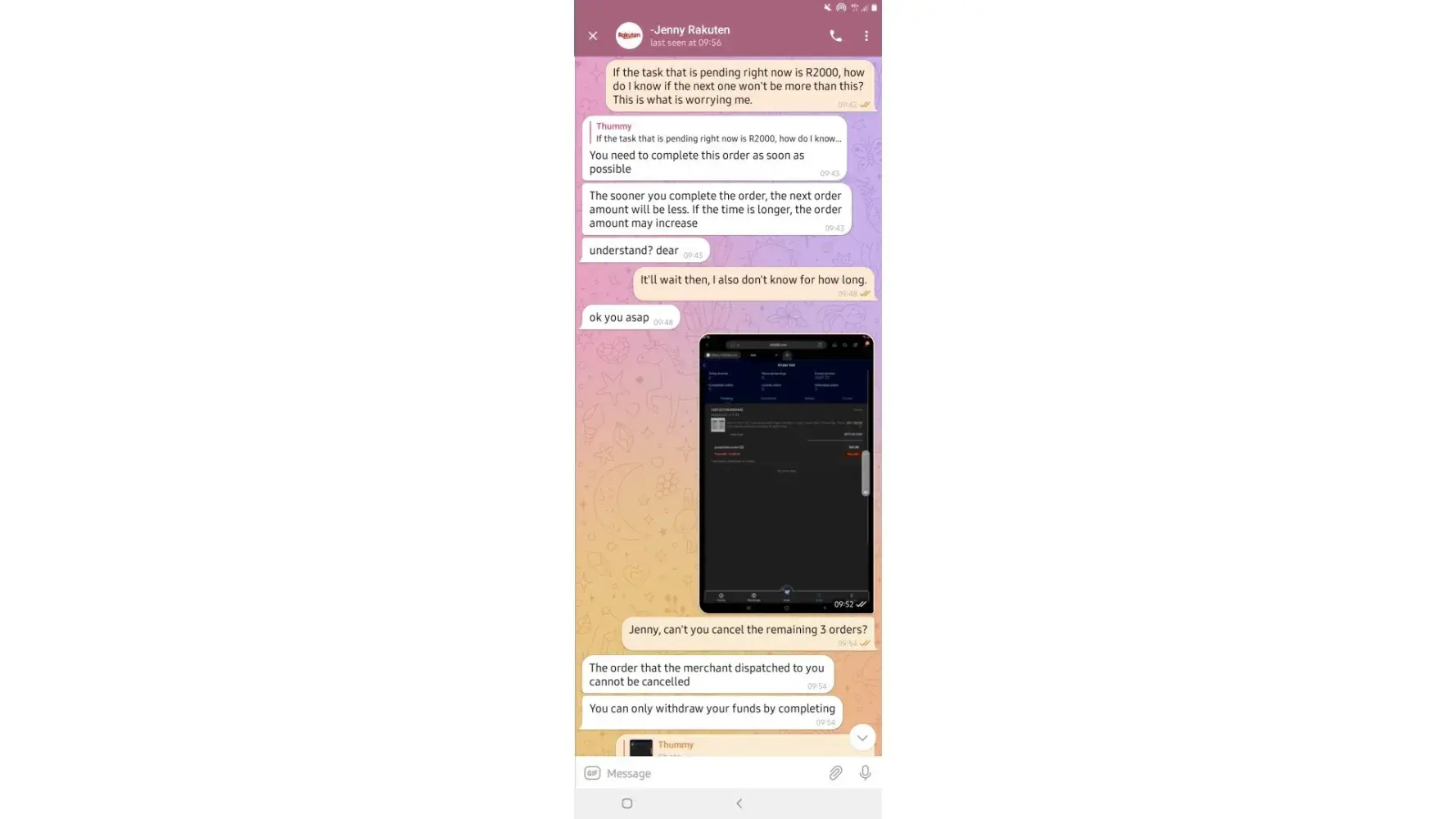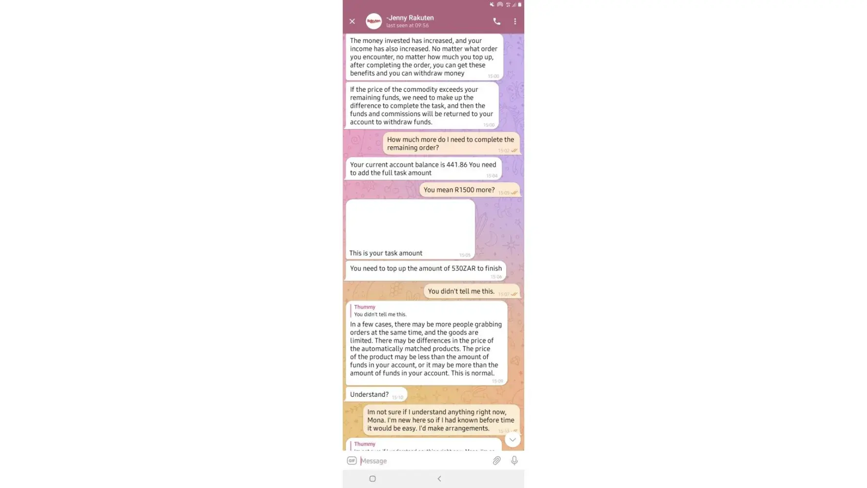 on 02/05/2022. which means losing all the money I put in which is R6 432. I have fully completed 7 orders and I'm left with one. Replenishing to pay for orders was not communicated by the customer service before I started this mission, I only got to know about it when it happened and I was told it was normal because the system just dispatches orders.
