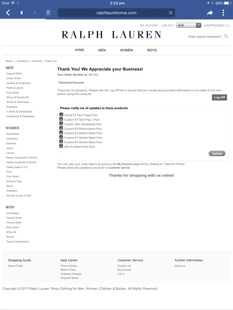 Long story short! I've placed an order with Ralph Lauren and they took my money. Several days later I asked for a tracking number and they gave me one. Everything seemed fine but then I've decided to track my order and was not able to do that. I contacted Ralph Lauren and asked what was wrong with the tracking number they gave me and their rep said that my order wasn't even shipped because it was out of stock. They said that I probably received a tracking number by a mistake. Asked for a refund and they said sure no problem. So here I am two months later and still no money. So people, think twice before you decide to buy something from Ralph Lauren.
