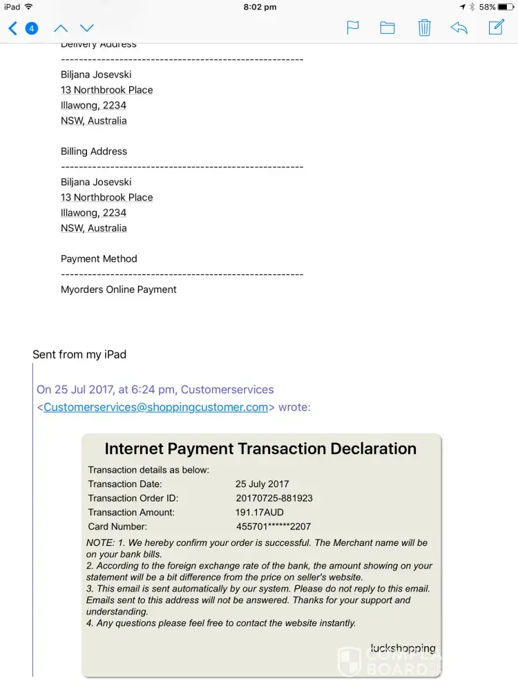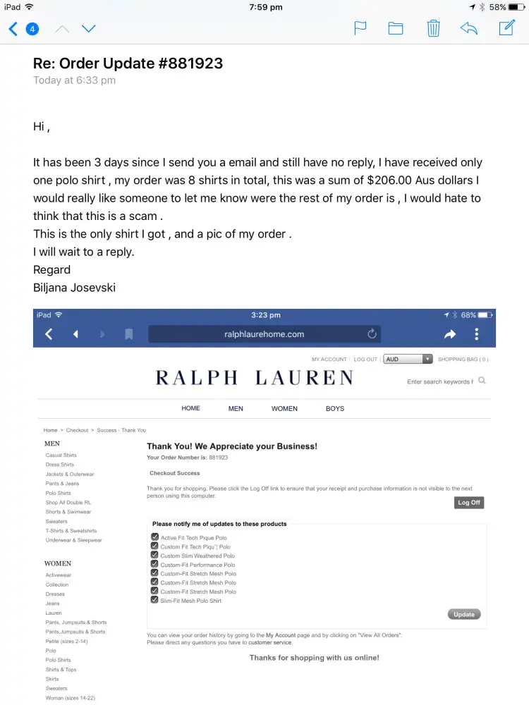 I paid for 8 polo shirts on line at a cost of $206 Aus dollars, I received only 1 shirt, I have send 5 emails only to have them bounce back, this is very poor service from such a big brand company, I only want what I paid for, but I'm starting to believe this is a scam company I can provide what you want to prove the payment and order, if I don't get any answers from you I will take this further, my email is [protected]@yahoo.com.au My number is