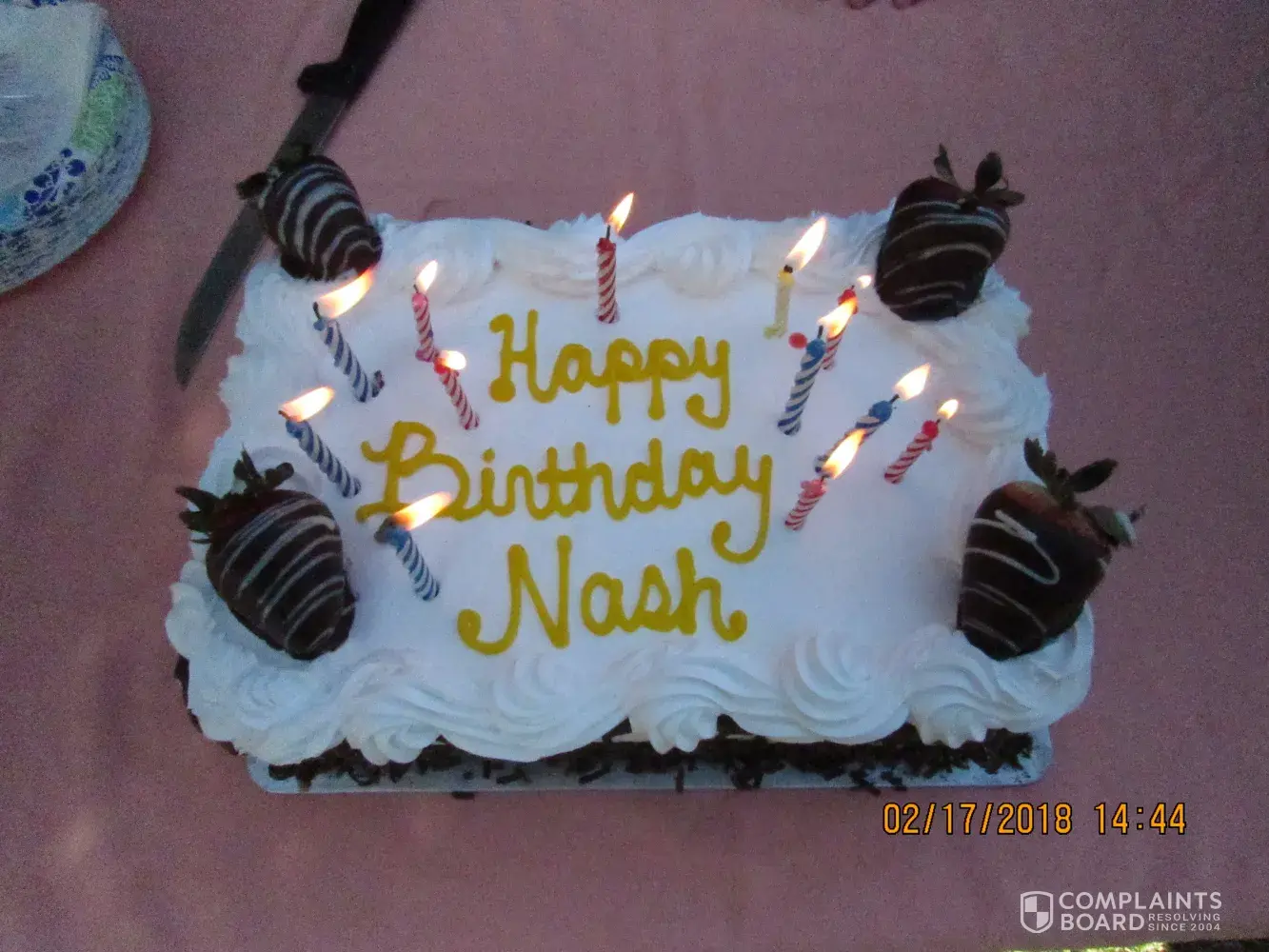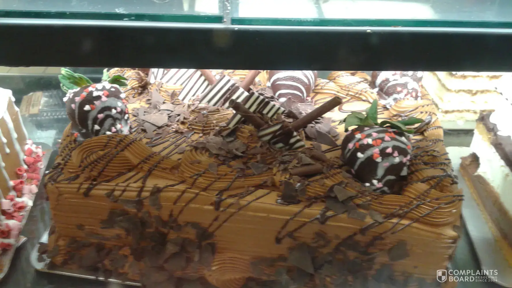 On the day of the birthday, on 02/17/2018 I was there again to pick up the cake at about 11.00 am . This time Veronica and Corey were there and she proceeded to take the cake out of the refrigerator and place the strawberries on the cake. I could not see the cake as she had her back behind me and when she turn around towards me, I was horrified to see a white cake with chocolate covered strawberries. I told her that it was not the white cake that I ordered and showed her a picture of the chocolate cake on my cell phone that I have snapped on the day I placed the order with Corey.