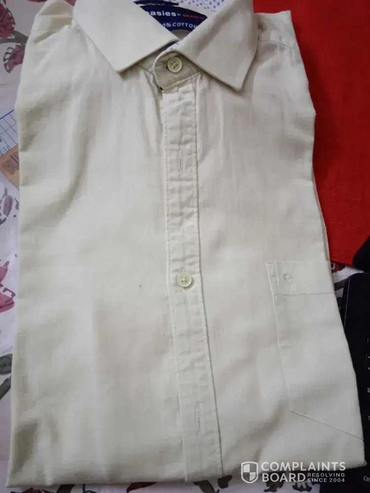 On enquiry, it was told that the shirt was washed with jeans and it had got discoloured. They did attempt to get it back into same colour however the same had failed and the shirt cannot be worn anymore.