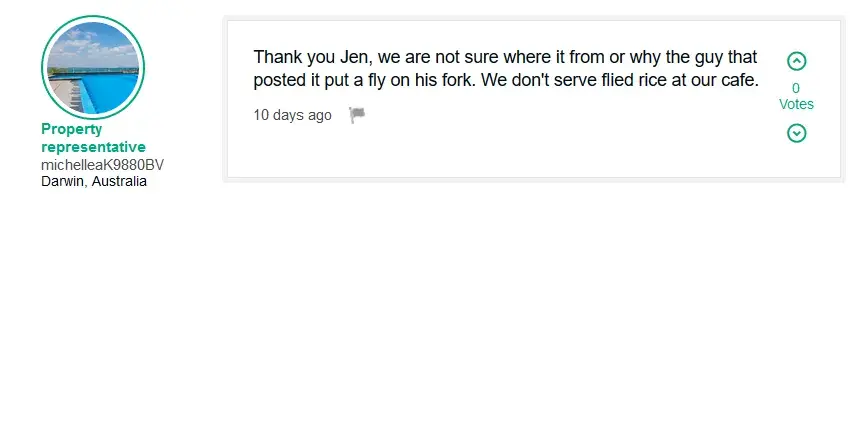Another issue I want to raise up is I posted a comment on tripadvisor and attached the picture with the fly in my food. The representative named michelleaK9880BV accused me of putting a fly on the fork and did not respond to any of my other comments on the review. I would like to point out one thing, the purpose of me or other guests giving reviews and feedbacks is to encourage staff to reflect and improve, rather than acting defensively.