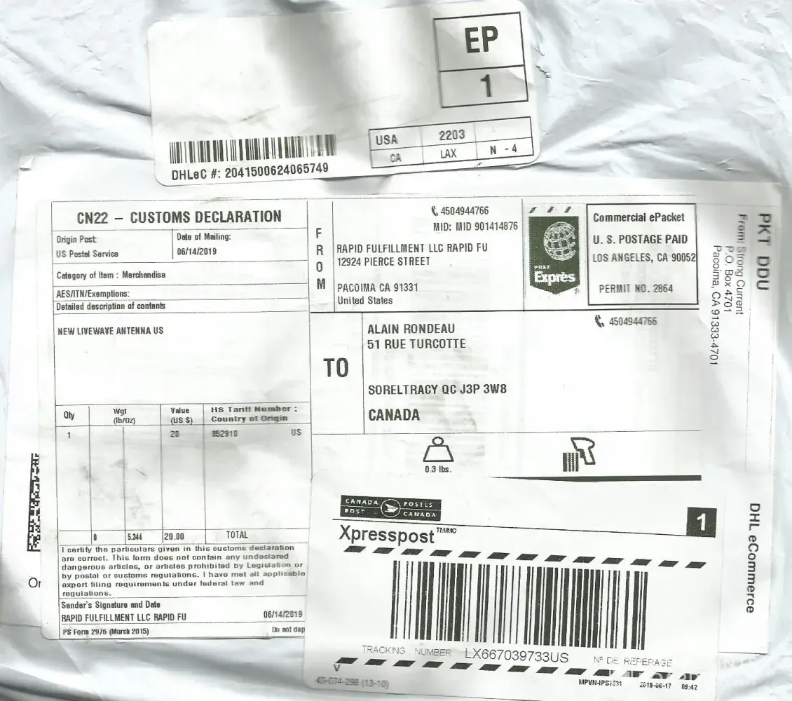 I ordered a TVFox Antenna from Strong Current Enterprises, which shipped the item to me via Rapid Fulfillment Inc of 12924 Pierce St, Pacoima, CA 91331.