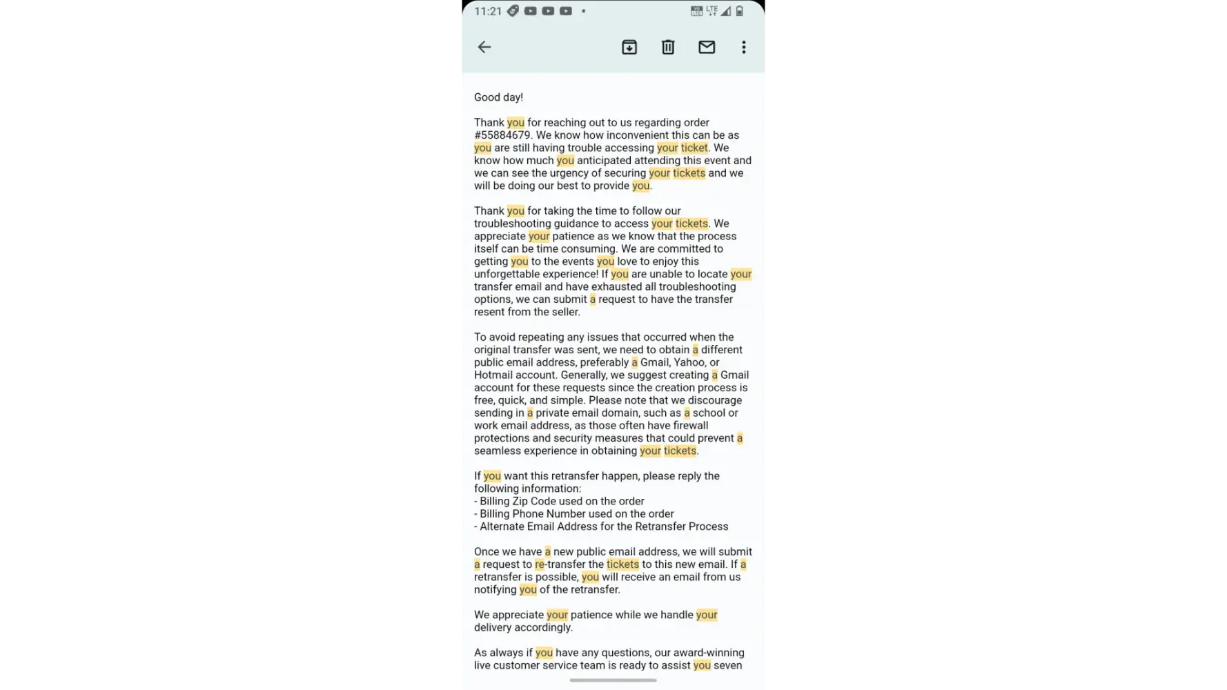 To sum it up, I don't think I will ever use this company again, and I warn others to be careful when buying tickets through them. It's just not worth the risk of losing your money and being left with an unusable ticket for a concert that is a year away. I hope that other customers have better experiences than I did and are able to avoid the disappointment and frustration I experienced.