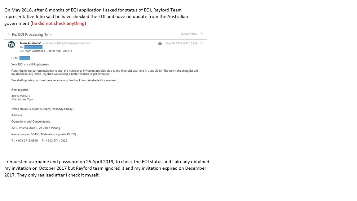 -On May 2018, after 8 months of EOI application I asked for status of EOI, Rayford Team representative John said he have checked the EOI and have no update from the Australian government (he did not check anything)