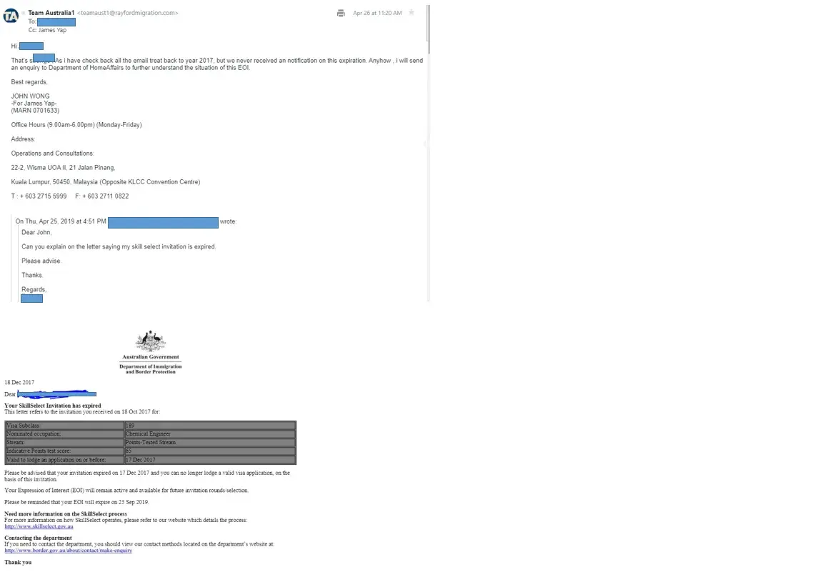 This is a very irresponsible migration company. They do not even check their work and task. I was charged 5000 AUD for 190 visa application. I actually managed to get invitation for Australian Permanent Residency, but due the company's negligence the invitation was expired on Dec 2017. I asked for whats the current status on May 2018, their manager, John said he have checked but there is no update. However, after getting advice from other migration lawyer I requested the username and password on April 2019, than only i found that the invitation already expired on Dec 2017 myself. When I asked for clarification, John said they did not receive the email regarding the invitation to apply for permanent residency.I have attached the screenshot of our communication so that no one else will get cheated by this company anymore. They talk nicely until they get your money, later they will be very rude and will not entertain any of your request or update your situation.