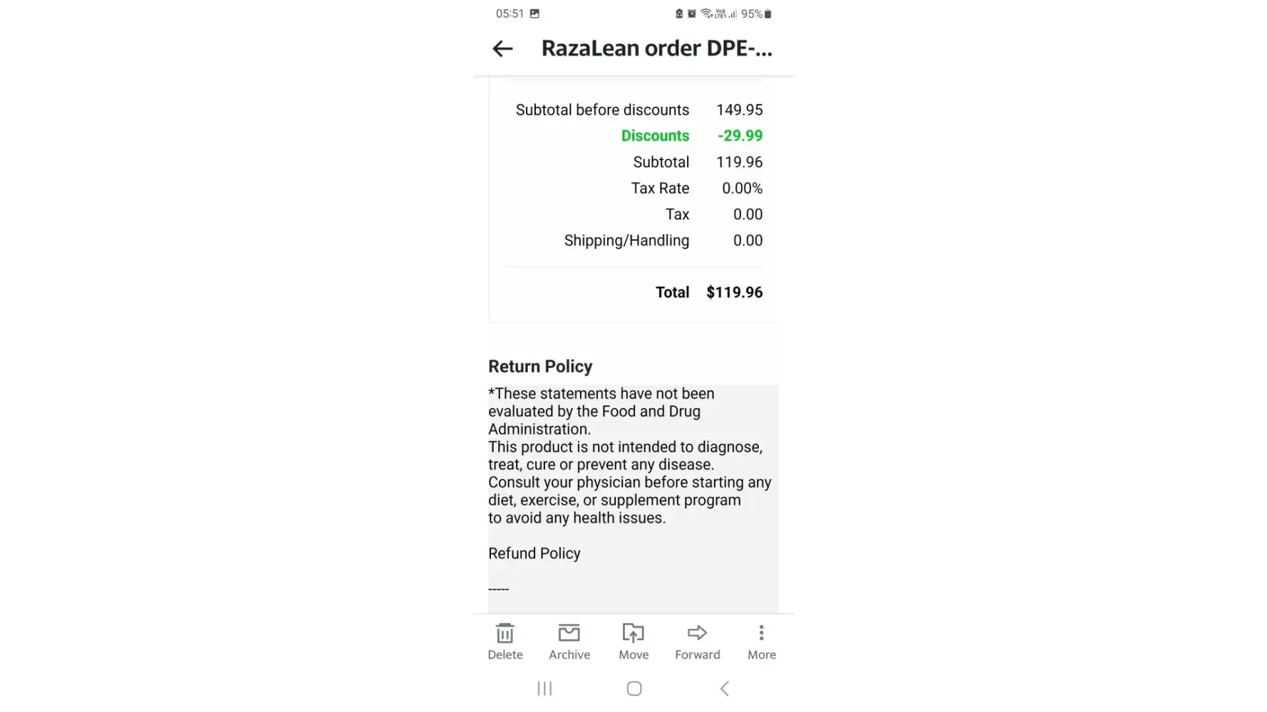 I returned my Razalean product with all of it being unopened per their return policy. When I received my credit back on my card they kept $6.57. They said it was their cost of shipping the product. No where does it say they will hold any shipping charges. This was and item because if the quantity ordered was free. The only thing was I had to pay the shipping charges back which I did. I think they should not be able to keep the other $6.57 in addition there is nowhere that amount shows except when I ask why I didn't get the full amount that was their response. You can never talk to someone in person because they won't answer their customer service number or return your call even if message and contact information is left