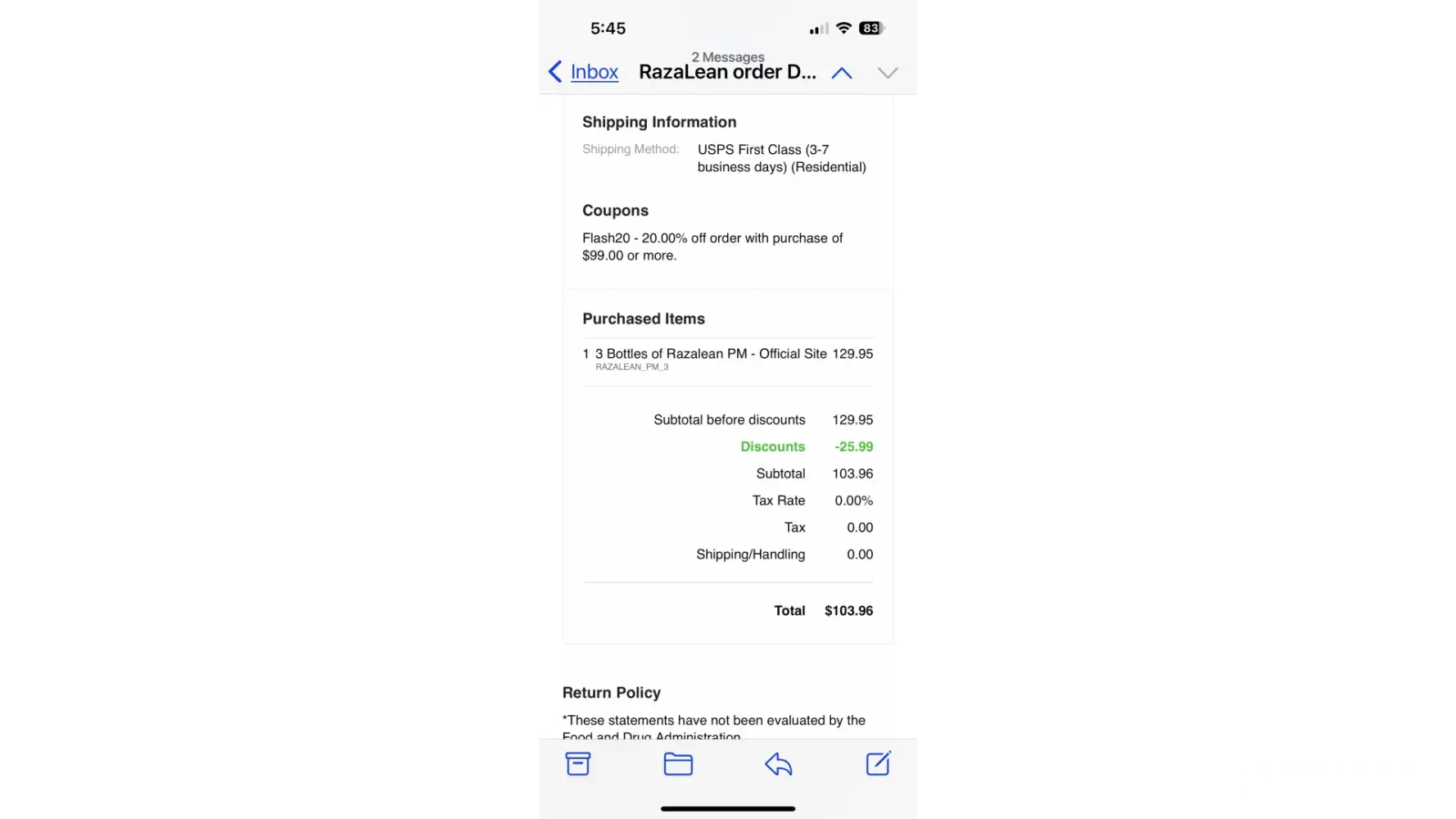 I paid 229$ for two orders of razalean. I should have received 5 bottles. I never received anything. I've emailed repeatedly. No response! Phone number given in ad is disconnected. I'm a repeat customer for years. Now I'm completely stiffed!
