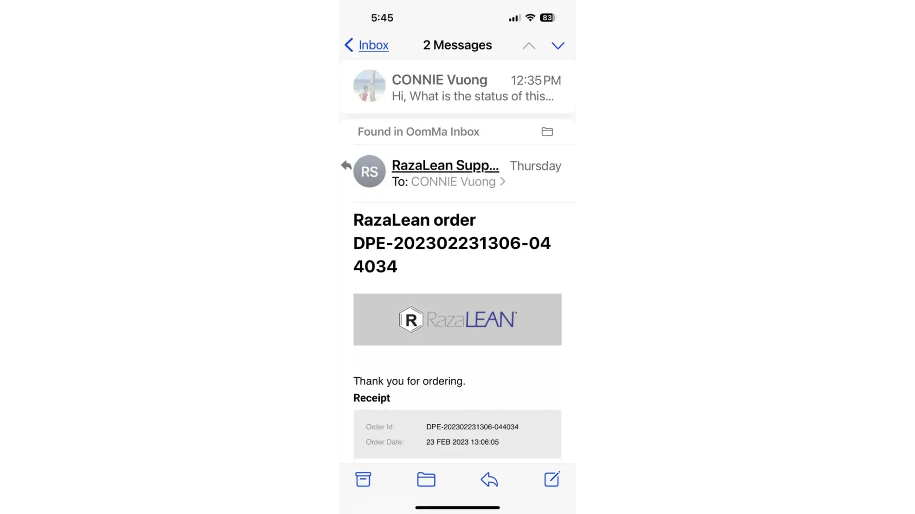On Feb 23, 2023, I placed an order for 3 bottles of RazaLean and I have not received any of them. I got NO shipping confirmation. I emailed support@razalean.com and I got no email response. The phone # listed [protected]) is no longer in service. I wonder if they are still in business.