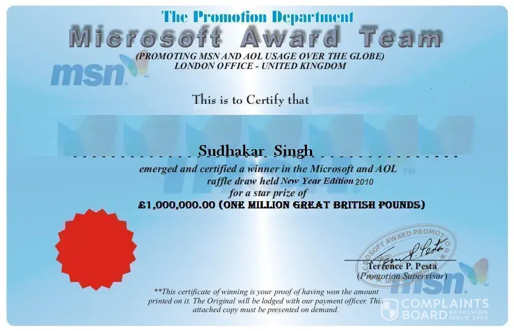 Sir i am sudhakar singh from patiala punjab .Please tell me bellow given information is right or wrong .Few day ago a mail announces me as a winner company name is (MICROSHAFT) and a diplomate came to india and call me .The contact no of diplomate is +[protected]. email.id is micro.[protected]@w.cn.
