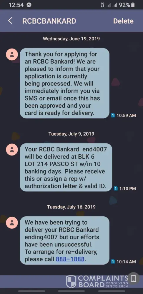 Good day! I was approved of my rcbcbankard last july 9, 2019 then july 16, 2019 I got a message saying, "we have been trying to deliver your rcbc bankard ending4007 but our efforts have been unsuccessful. To arrange for re-delivery, please call 888-1888." so I complied. I called them the same day to arrange my re-deliver. And until now, as of today, my rcbcbankard hasn't arrive at my billing address. It's still on transit. It's almost 1 month upon my re-delivery request. I've been following up everyday. Still no positive answers. Kindly do something please.