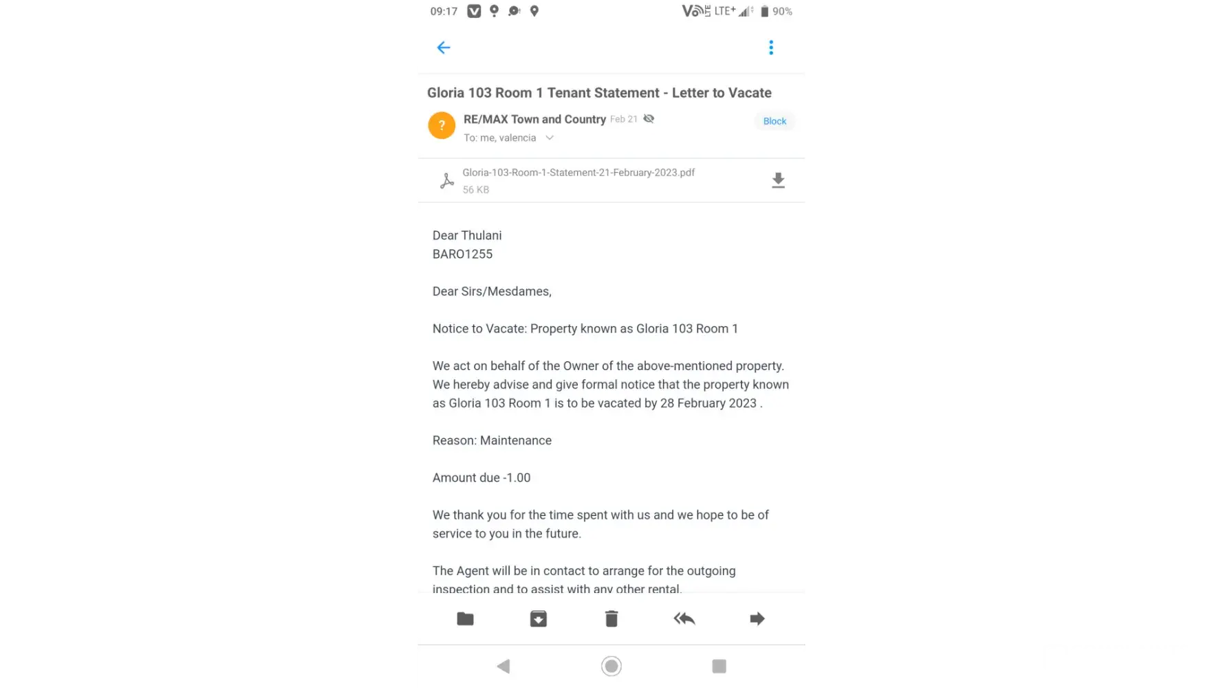 I'm currently crossed and disappointed after I've been loyal to you for almost 2 years I received an email from Remax on the 21st of of February asking to vacate the premises 28th February and that's such an unfair short notice, the reason was they wanna Renovate the premises.