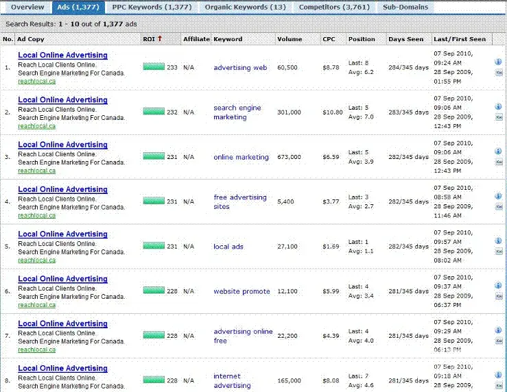 Unfortunately the screen capture shows only 8 their ads, in reality there 1, 377 same Ad Copies for different keywords that means in most cases they paid extra for non-relevancy with time frame almost 280 days per year. They vigorously were thrashing their money (how stupid it is) without any test or experiment to get a cheaper price for its own pay-per-click program. Do I have to trust them that other 300, 000 compains for other businesses are run differently and more professionally?