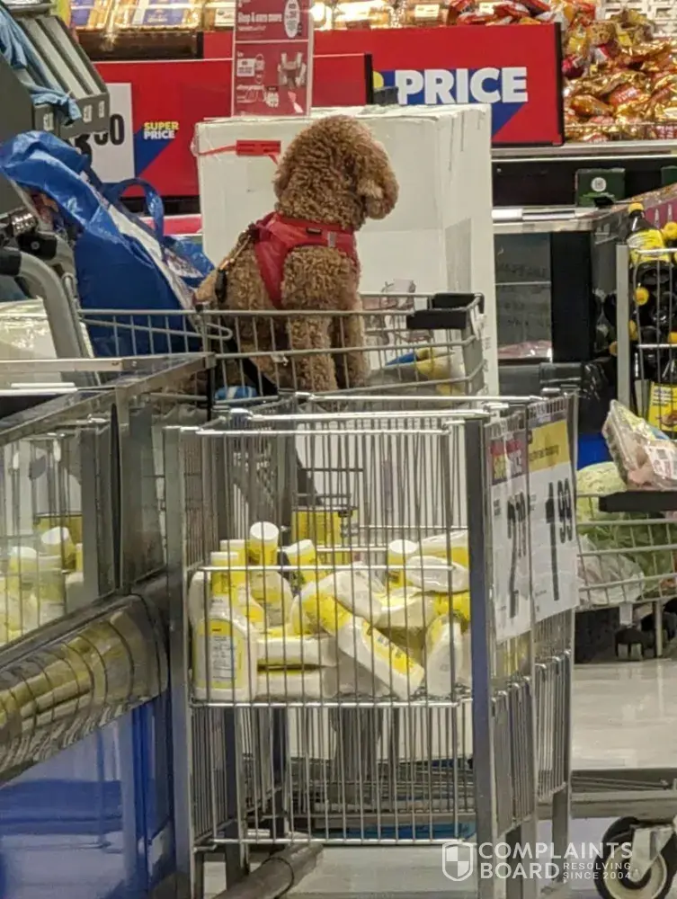 Watched a woman bring a dog into the store and put it in the shopping basket. Obviously, not a service dog (I would not complain about that). Off she went up and down the aisles to do her shopping I went to Service Desk to ask about the store policy regarding dogs and was told that it was a 'tricky' situation. Was told that the dog might be an 'emotional support' animal. Great! What about my 'emotional trauma' the next time I use a buggy wondering if some animal peed (or worse) in it. Nothing was done about it which did not surprise me. Not blaming the service desk person. We live in disturbing times where correcting someone is a risk.