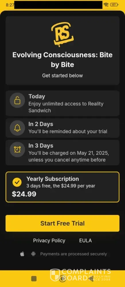 Apparently I was not charged (which is false) and I am using free reign to lie about Reality Sandwich (false). Here is the undisputable evidence I was charged, and the app did scam me out of GBP 23.49, on the 18th and not the 21st, and the app took the payment at the start. In legal definition, the 3 day sign up ruse is a scam, and to use their words, scammy.