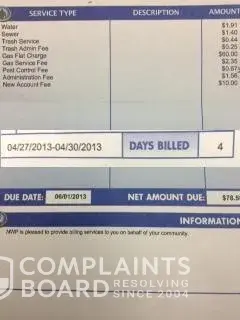 I recently moved into an apartment here in Farmington Hills. I got a new job and previously lived in Kalamazoo, MI - about a two hour drive. I happened to be in town on April 27th, 2013 filling out some paperwork for my new job. I had a few boxes in my car that I was going to leave at my girlfriend's parents' house with me. I had been looking for a place to live for a few weeks, calling over thirty apartment complexes in the Walled Lake area to find that Independence Green was one of three that had anything available on such short notice. It had a washer and dryer in the unit so I decided I'd go check it out. I liked it and signed the lease that day since I was already there and so I could drop off the boxes I had and save myself about a half hour of travel time to get the boxes from her house. So I dropped them off and left. I came back on May 3rd with a UHaul and all of my belongings, almost a full week later. I was in the apartment dropping my boxes off for maybe ten minutes total. Independence Green uses a company called NWP Services Corporation to manage their utility billing. I was assured by numerous people who work for the complex that even though I was 'technically' moving in on April 27th and 'officially' moving in on May 3rd that my first utility bill would be very small and would of course be pro-rated. I was fine with this. Lo and behold I get my first bill, for less than four days (it was late afternoon when I signed the lease) I am charged $78.58. This is mind-boggling to me. The $10 new account fee, fine. It's an administrative fee that's surely unavoidable from reading some of the other complaints about this company. The thing that I don't understand though is why I'm being charged a "$60.00 Gas Flat Charge". I used literally nothing in the apartment while I was there for the ~10 minutes dropping things off and I certainly didn't use anything that would require gas - it was hot outside and there is a window AC unit, the range is electric and that bill is with a different company. I emailed the company, as per their request if you have billing issues - nothing. No response at all from anyone. No one at the complex told me anything about these random, seemingly unavoidable fees and there is absolutely no reason at all I should have to pay that. At this point I am at a loss as to how I should proceed. I'm not going to hire a lawyer over $60 but if I don't pay it it will go to collections and there goes the credit I've been trying to establish. The fact that there is a continuous monthly 'Administration Fee' is absurd too. These accounts sit in a computer system. Everything is done automatically. My previous job was for a bank and unless there's a problem with an account they just sit there doing there thing. Why should I have to pay to have pay for something which wasn't even explained to me in the first place? Not a good first impression with this company. The complex itself has been very accommodating but this NWP Services Corporation I have a feeling is going to turn into a nightmare to deal with. Any advice would be strongly appreciated. I would also recommend (if possible) trying to avoid complexes who deal with this company. Including an image I took. It's two pictures of my bill; I copied parts of them together so it didn't have any of my sensitive information visible.